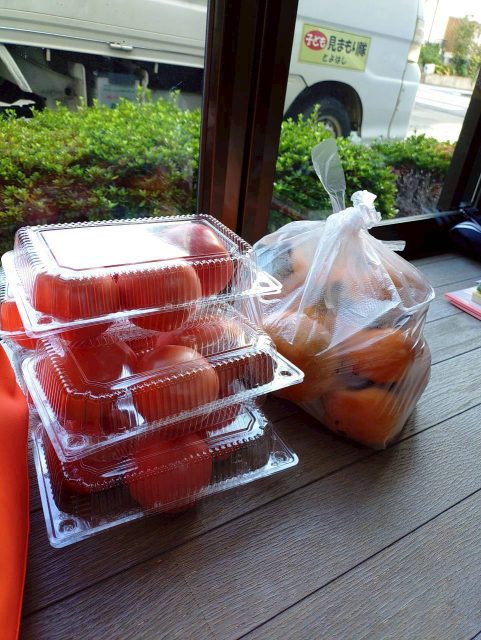 最後に、各地から持ち寄られた豊川小坂井産・トマトと豊橋石巻産・次郎柿のお土産がありました。