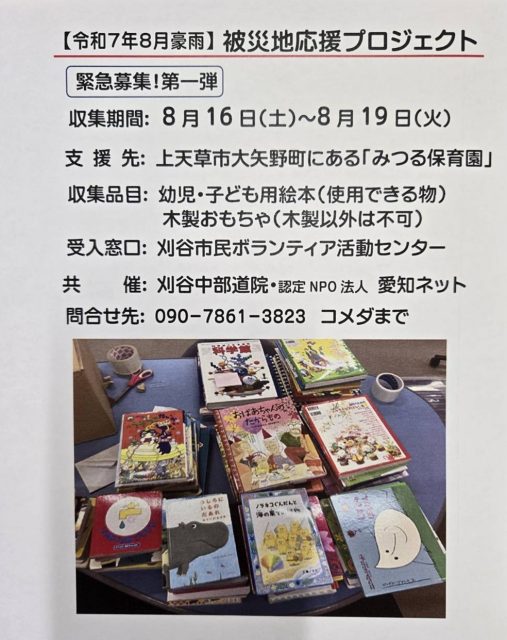熊本県阿蘇郡西原村にある西原スポーツ少年団の竹下あずさ先生より、上天草市大矢野町にある「みつる保育園」が絵本や木製おもちゃがなくて困っているという情報を入手した。早速、被災地応援プロジェクトを立ち上げた。刈谷市内の団体に8月16日・17日・19日の三日間収集を呼びかけた。結果、団体や市民から絵本527冊、木製おもちゃ9セット、鉛筆や定規などの学用品770点が集まり、竹下先生経由でみつる保育園に届けていただいた。なお予定よりたくさんの絵本などを提供していただきましたので、別の保育園に送るため現地へ持参することにした。この活動に対して団体や市民のみなさんにご協力いただきまして有り難うございました。なおこの活動は9月末にて一旦終了としました。