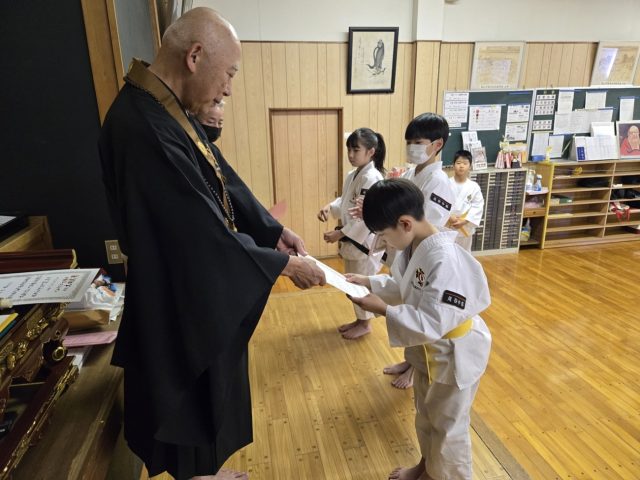 昇級試験にて合格した二人に合格証書を渡しました。受験にあたりよく頑張りました。大きな自信としてください。おめでとうございます。