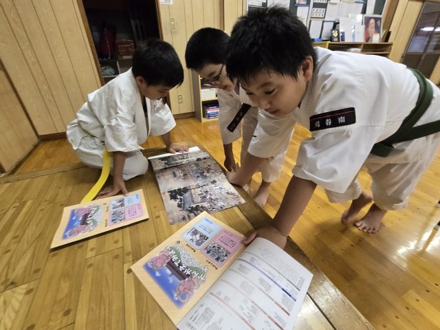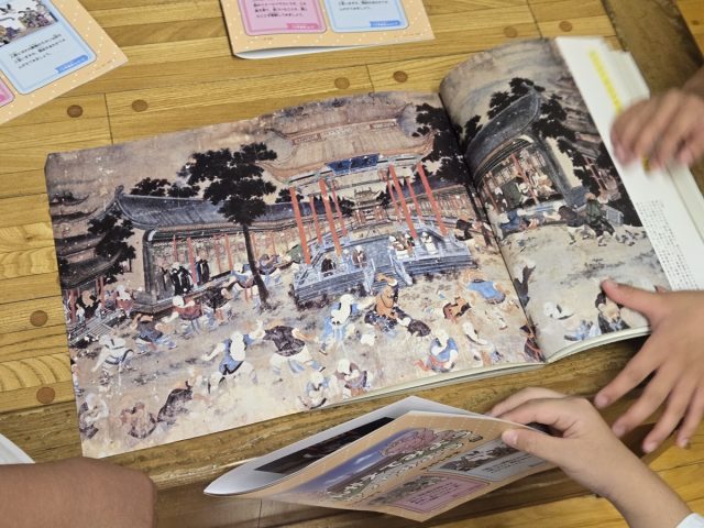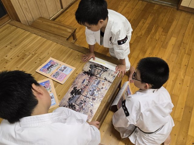 今回の問題は少林寺拳法の本でよく見かける嵩山少林寺百衣殿に壁画についての問題である。この壁画について感じたことを出してもらった。「楽しそうに稽古している」「肌の黒い人も混じって稽古している」「戦っているのではないよね」「笑っているいよこの人」など様々な声が聞かれた。少林寺拳法の修行の原点であり修行していた様子を描いたものなのです。次回はこの壁画と少林寺拳法のつながりについて考えてみよう。