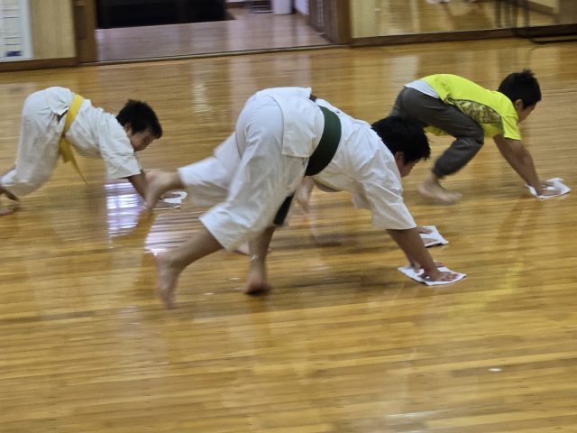 修練のはじめは作務(雑巾で綺麗に)でスタートします。体験者も一緒に行います。とっても楽しく次第に子ども達は競争を始めます。この日は10分以上かけて丁寧に行いました。
