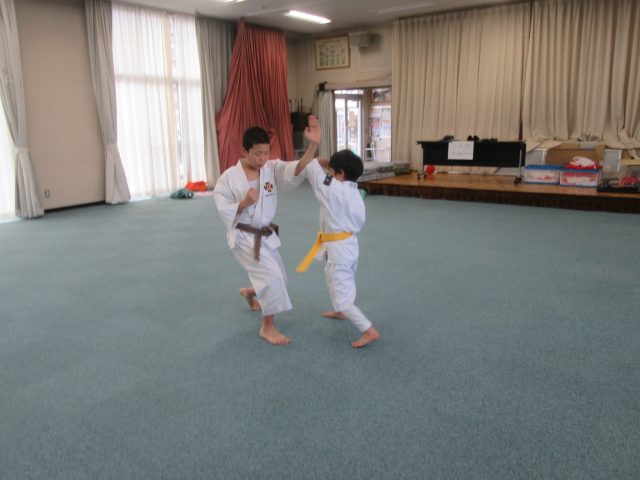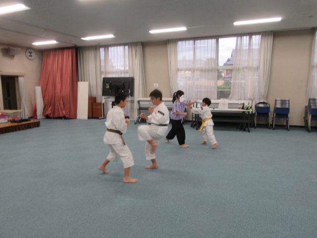 小5六級のA君が13時半頃参座の予定でしたので、それまで少年七級と少年二級の科目を進めておくつもりでしたが、体験入門中のRちゃんが到着。先週行った「内受突」と「外受突」の反復に移ります。その後A君も到着し、今日参座予定の全員が揃いましたので、ラストの説明時の内容も考慮して修練を進めます。