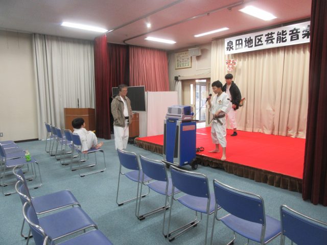 鎮魂行後に演武習熟に努め、その後前日準備の終わった市民館ホールに行き、明日の演武披露のイメージトレーニングやスペースの確認も行います。準備を終えられた来年度の公民館長さんが、わざわざ会館にいらっしゃって、「明日はよろしく」と声をかけて下さいましたし、地域行事を盛り上げつつ、道院活動をみんなで楽しみたいと思います。
