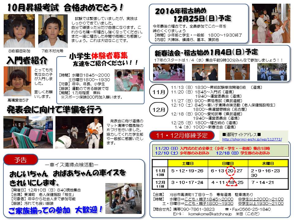 | 2025.11.15 刈谷北道院 11月15日(土)の修練。 本日は、専有道場からのスタート。穏やかで暖かな土曜日の午後に、皆が集まります。中学校の定期テストや体調不良等での欠席もちらほら。私自身も昨日から若干の風邪気で、... | |